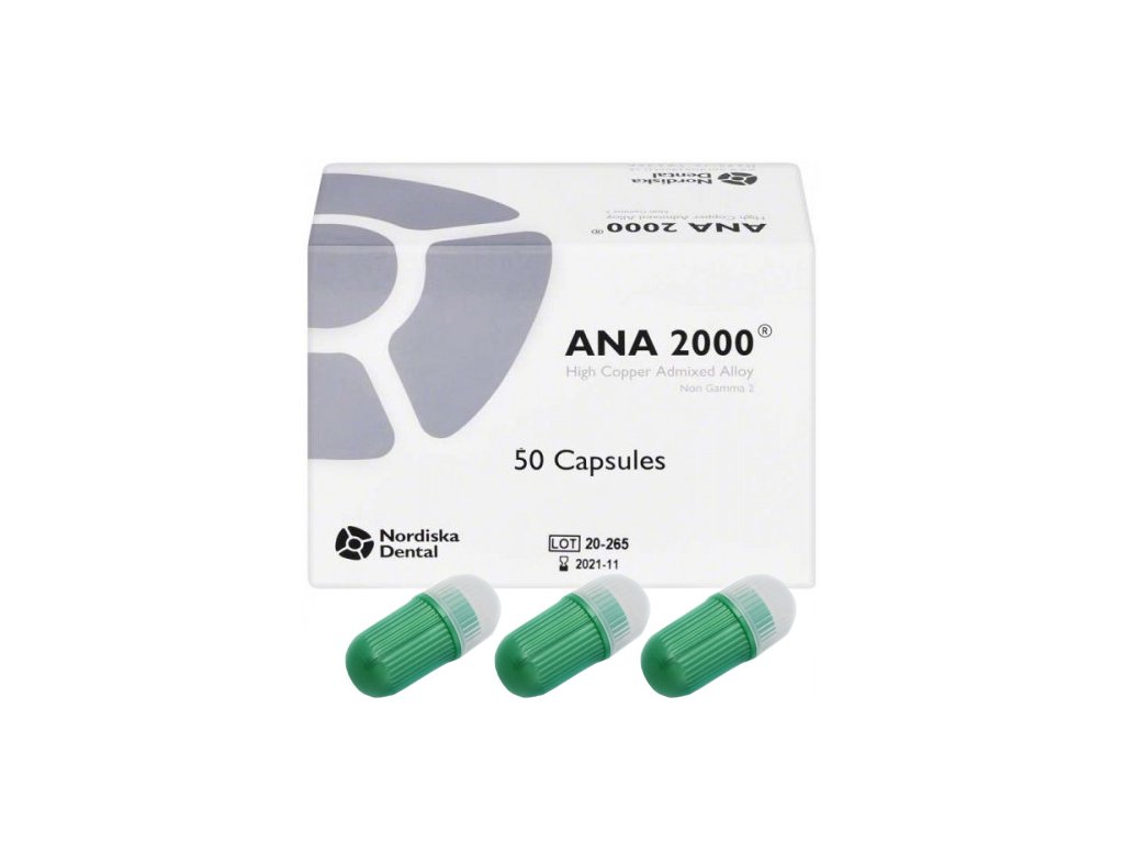 Kapslovaný amalgám ANA 2000 obsahuje 43,1 % Ag, 26,1 % Cu, 30,8 % Sn.