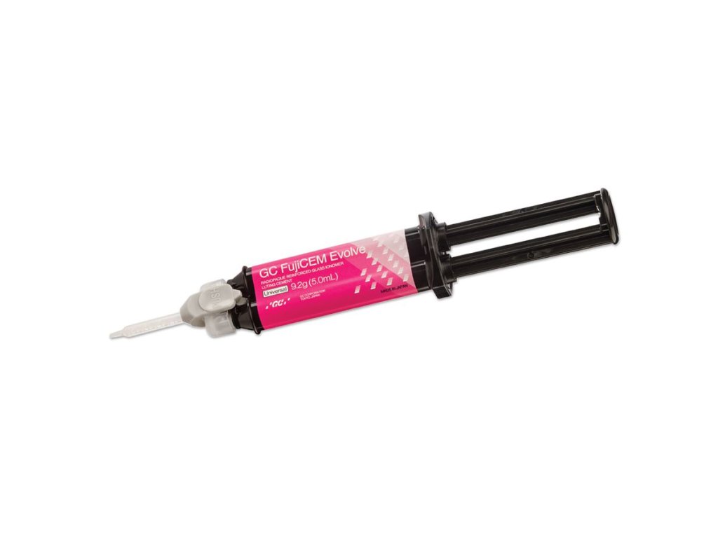 GC FujiCEM® Evolve je radioopákní skloionomerní cement vyztužený pryskyřicí ve stříkačce s automix kanylami. Lze jej použít k cementaci různých materiálů a různých typů nepřímých náhrad. Má vyšší pevnost vazby k zirkonu než konkureční výrobky. Nová funkce tack-cure zkracuje dobu čištění přebytků na několik sekund a jeho vysoká radiopacita umožňuje snadnou vizualizaci. GC FujiCEM® Evolve se vyznačuje také dobíjecím uvolňováním fluoridu a tolerancí vůči vlhkosti.